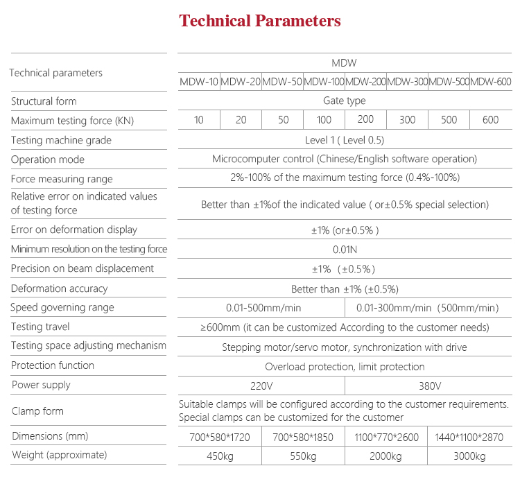 Mitech MDW micro control series gate type electronic universal testing machine, through the computer control motor drive screw, equipped with the corresponding auxiliary for metal, non-metallic and composite materials for pull, pressure, bending and other mechanical properties test (Tensile test carried out between the upper beam of the main body and the moving beam. Compression and bending tests carried out between the table of the host and the moving beam). It’s adopts the built-in controller, AC servo motor, by computer-aided means to achieve powerful function with stable performance, strong structure, high reliability, simple operation, high degree of automation. It’s widely used in metal and non-metallic processing industry, quality inspection departments, scientific research and other areas of higher education institutions and it’s a necessary professional precision testing equipment for improve production efficiency and save production costs.